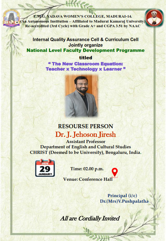 Internal Quality Assurance Cell & Curriculum Jointly organize National Level Faculty Development Programme titled “The New Classroom Equation: Teacher x Technology x Learner”